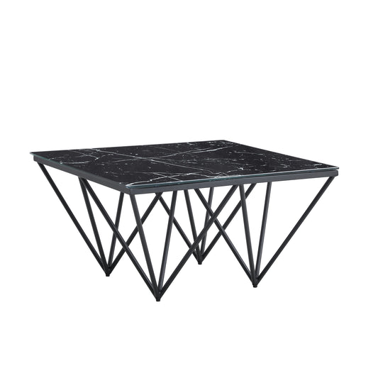 Table Basse Gizeh – Pieds Métal Noir & Plateau Verre Marbre Noir 80x80x45 cm
