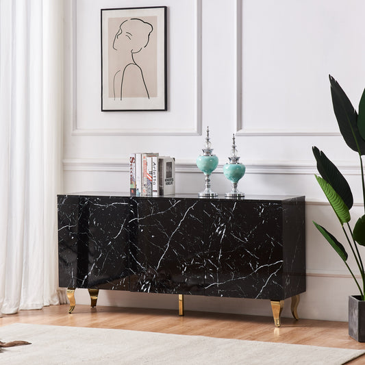 Buffet baroque laqué marbre noir 4 portes 180x40x80 cm – Pieds chromés élégants