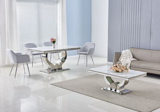 Table repas Ixe – Pieds métal chrome et plateau effet marbre blanc 180x90x70 cm