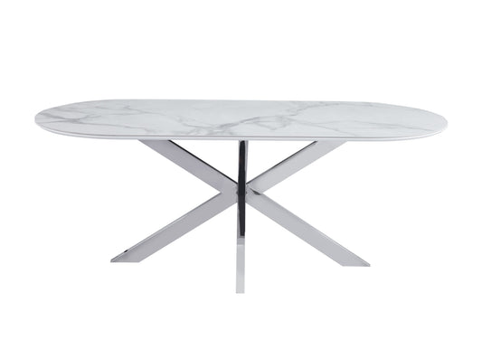 Table à manger Graffi – Pieds chrome et plateau céramique effet marbre blanc 180x90x75 cm