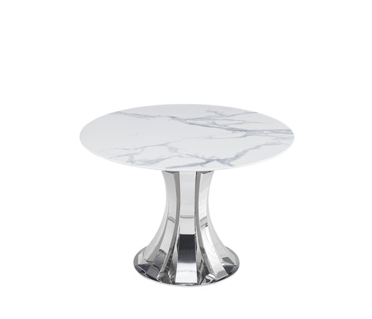 Table à manger ronde Judith – Pieds chrome et plateau céramique effet marbre blanc Ø120 cm