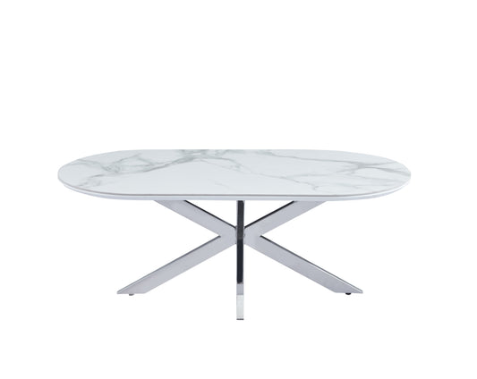 Table Basse Manon – Pied Chrome & Plateau Céramique Effet Marbre Blanc 120x60 cm
