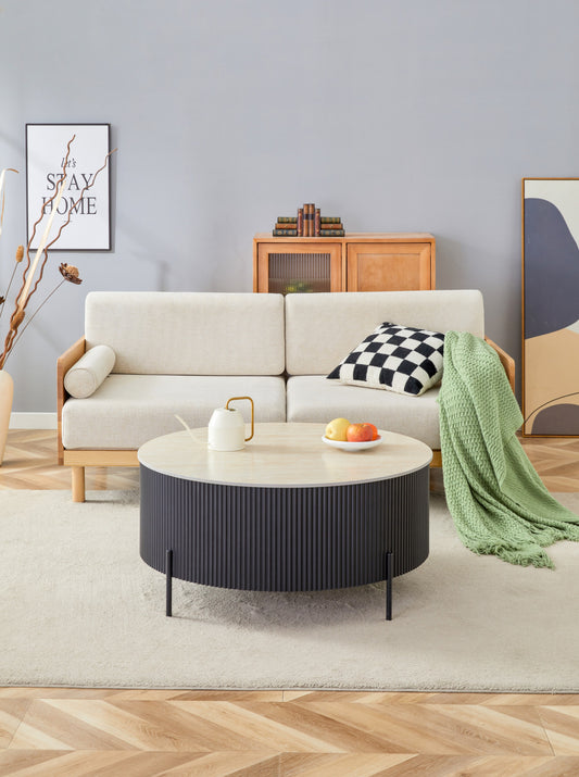 Table Basse – Pied Noir & Plateau Céramique Effet Travertin Mat