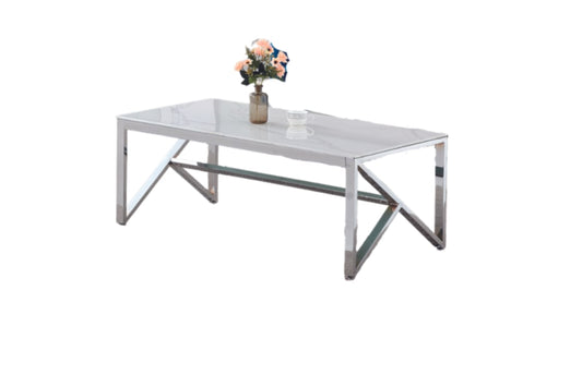 Table Basse Majestique – Métal Chrome & Verre Effet Marbre Blanc 120x60x45 cm