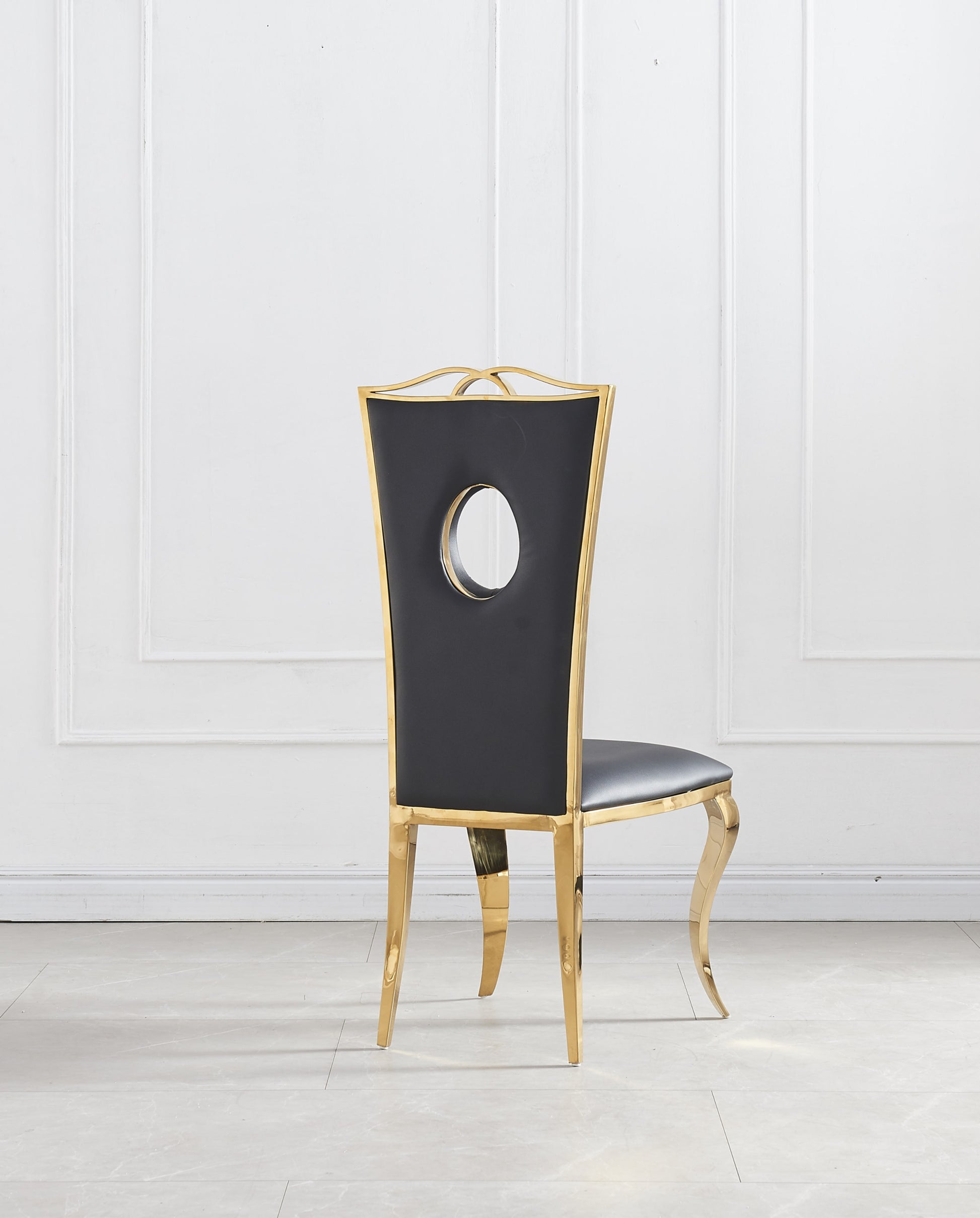 Élégante et sophistiquée, la chaise Royal Gold combine un revêtement en similicuir noir raffiné avec un piètement doré brillant. Son assise confortable et son style chic en font une pièce parfaite pour sublimer une salle à manger moderne ou glamour.