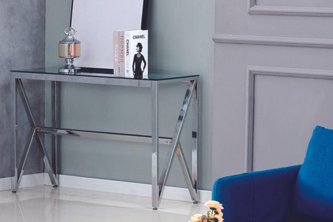 Console Majestique en Chrome avec Plateau Verre Transparent – 120x40x78 cm