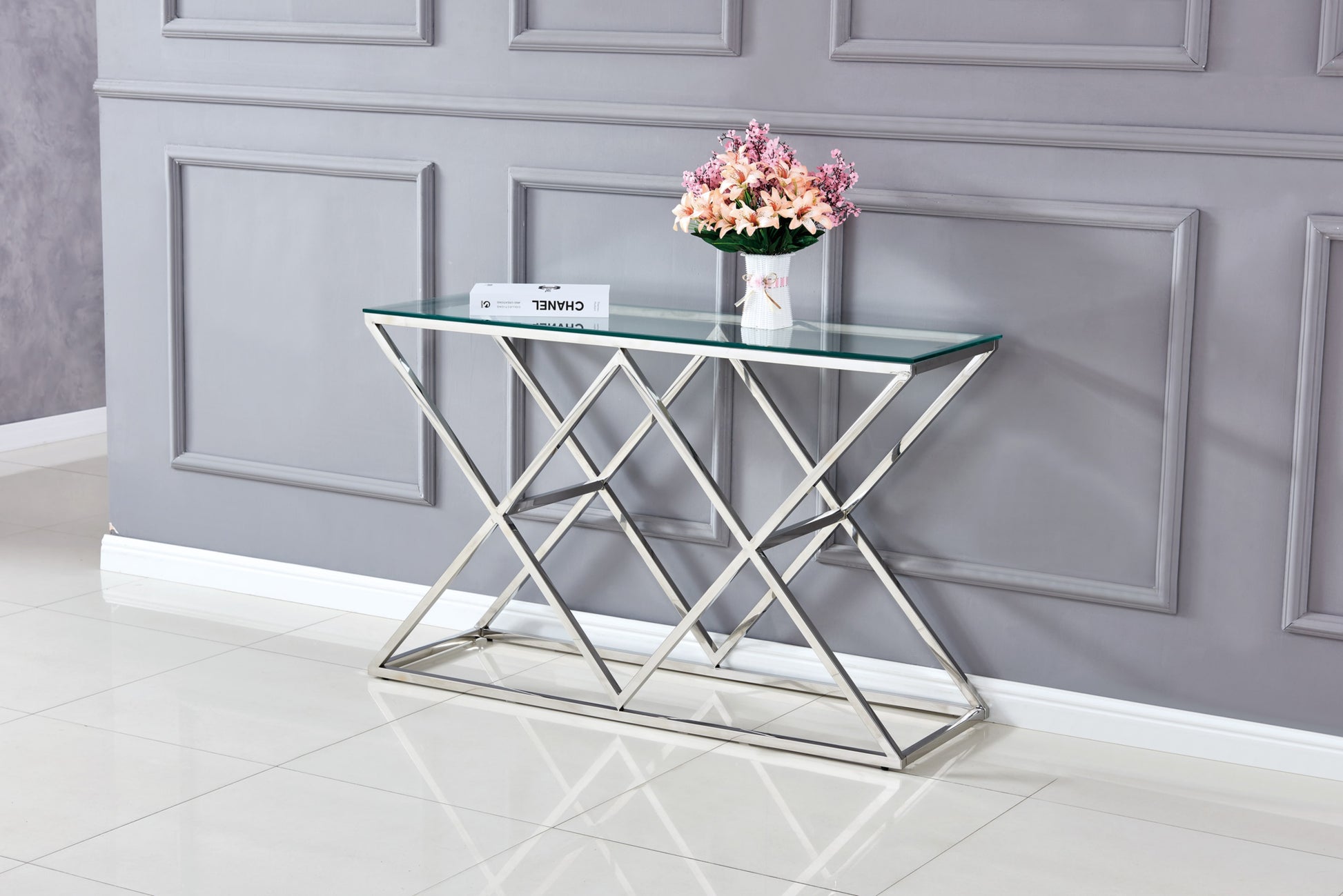 Console Triangle en Chrome avec Plateau Verre Transparent – 120x40 cm