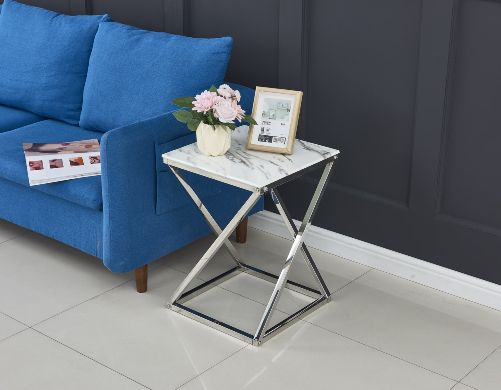 Guéridon Beverly Chrome – Plateau Marbre Blanc 40x40x55 cm