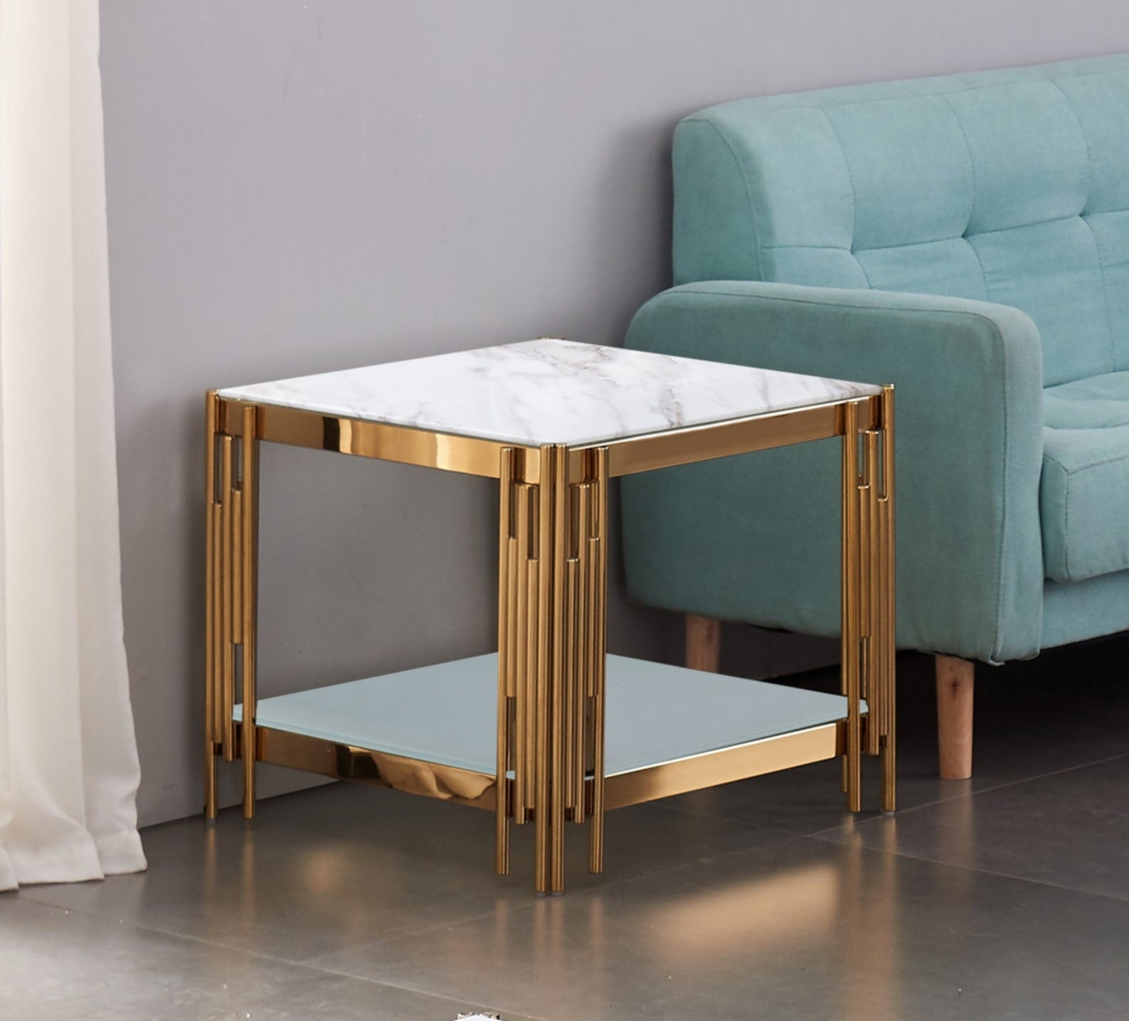 Guéridon Flute Gold – Plateau Verre Effet Marbre et Verre Blanc 50 cm
