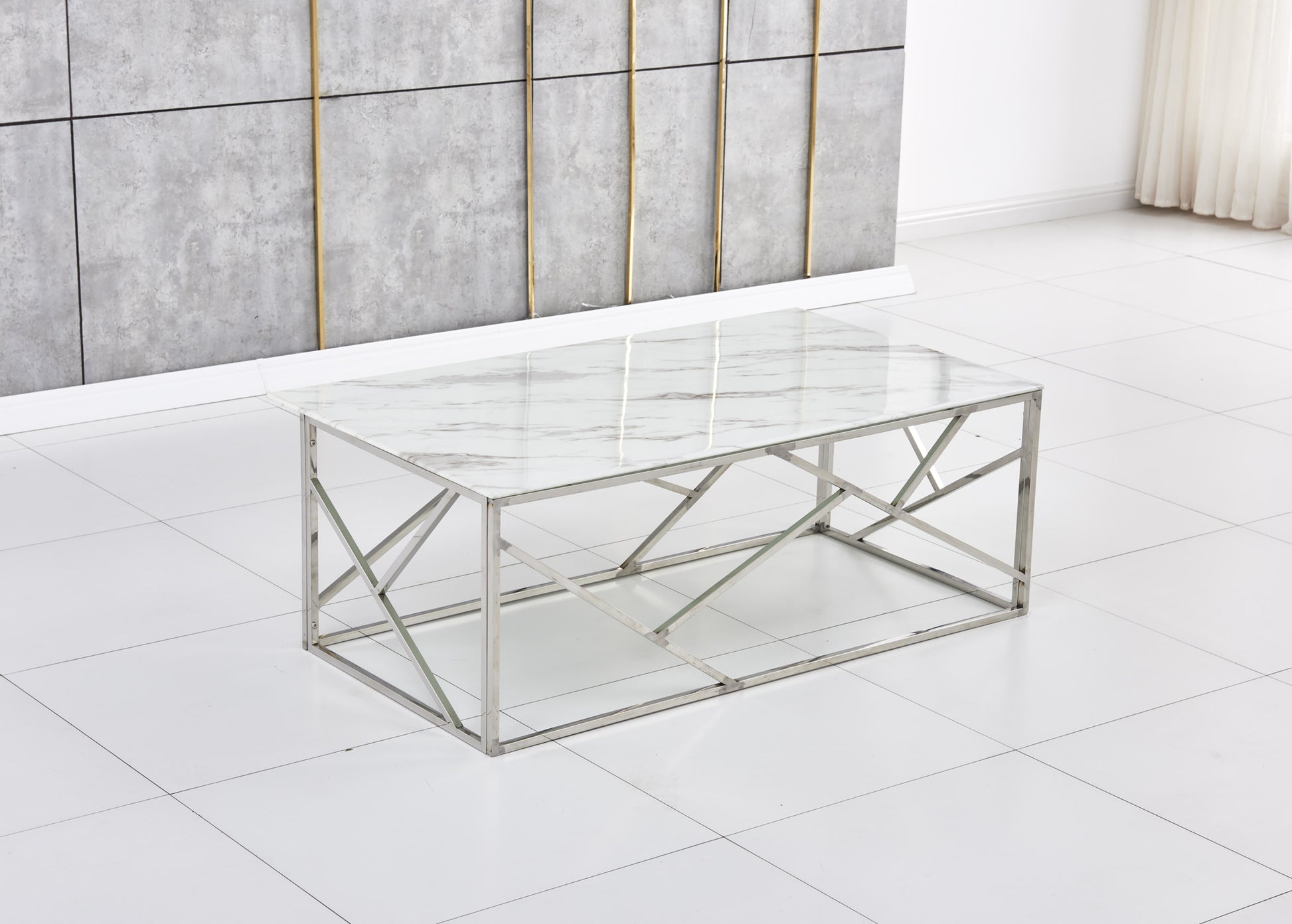 Table Basse Geomag – Pieds Inox & Plateau Marbre Blanc 120x60x45 cm