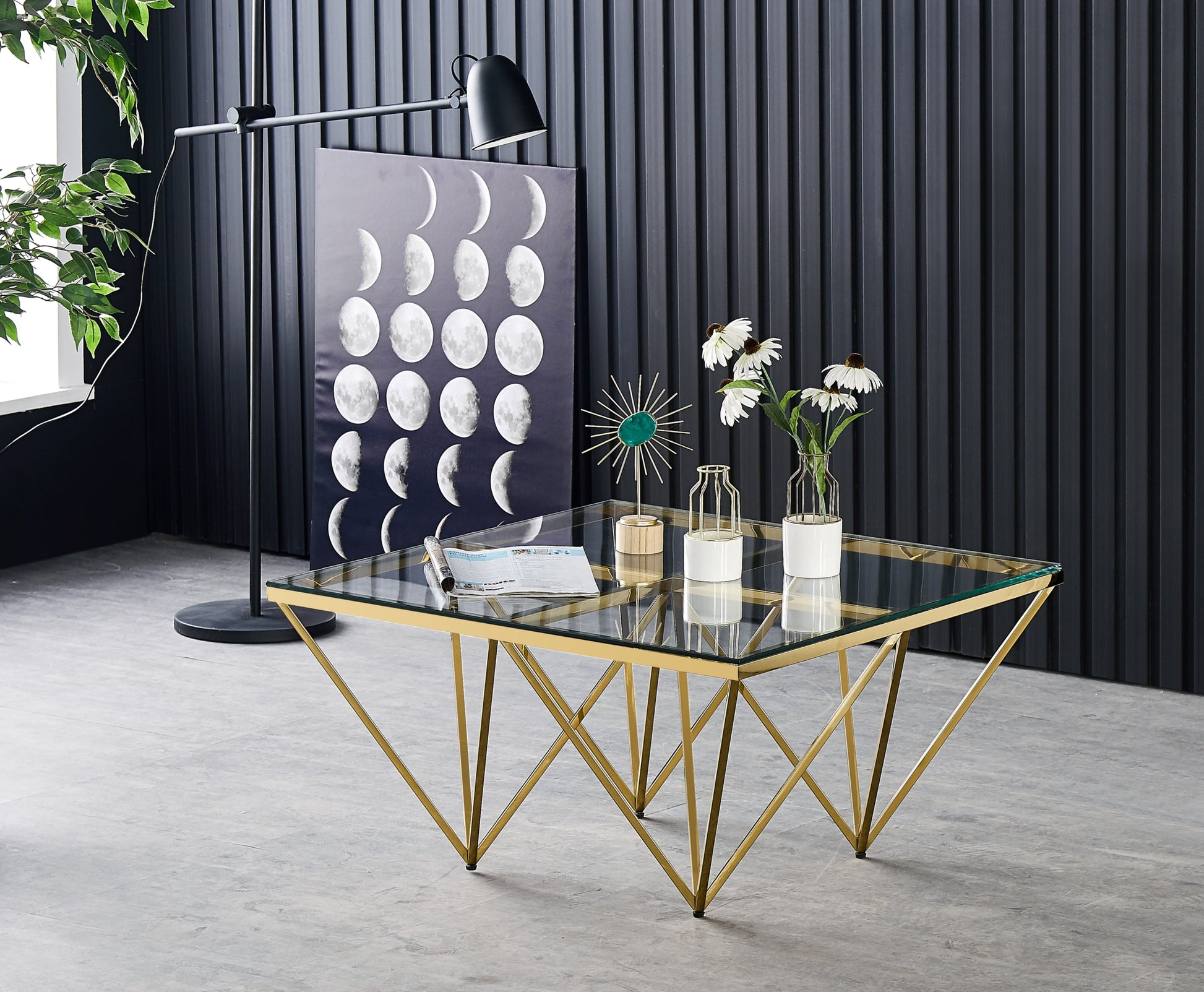 Table Basse Gize – Pieds Gold & Plateau Transparent 80x80 cm