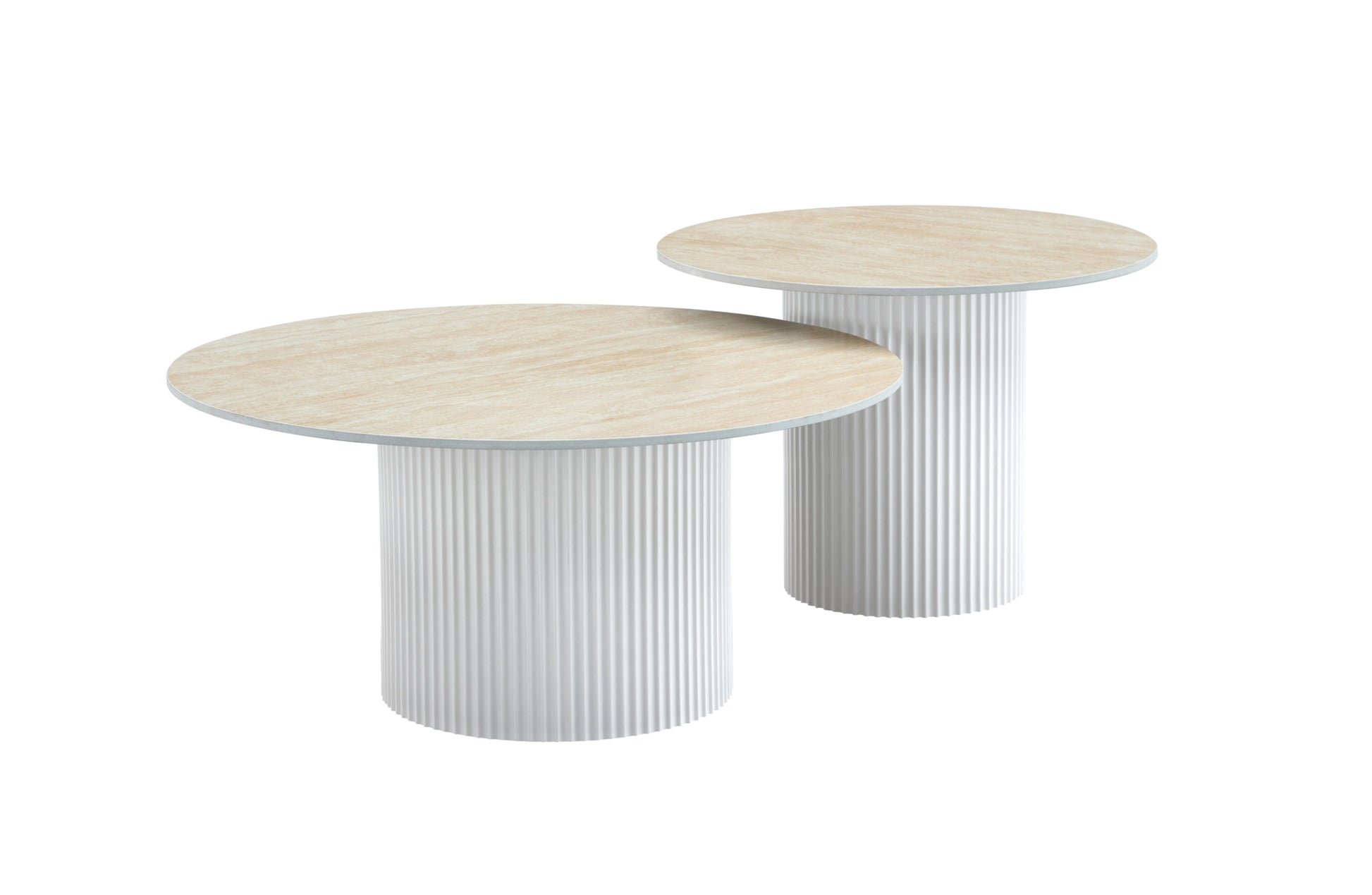 Tables Basses Gigognes Mina – Pied Blanc & Plateaux Céramique Effet Travertin Mat 60x45 cm + 80x38 cm